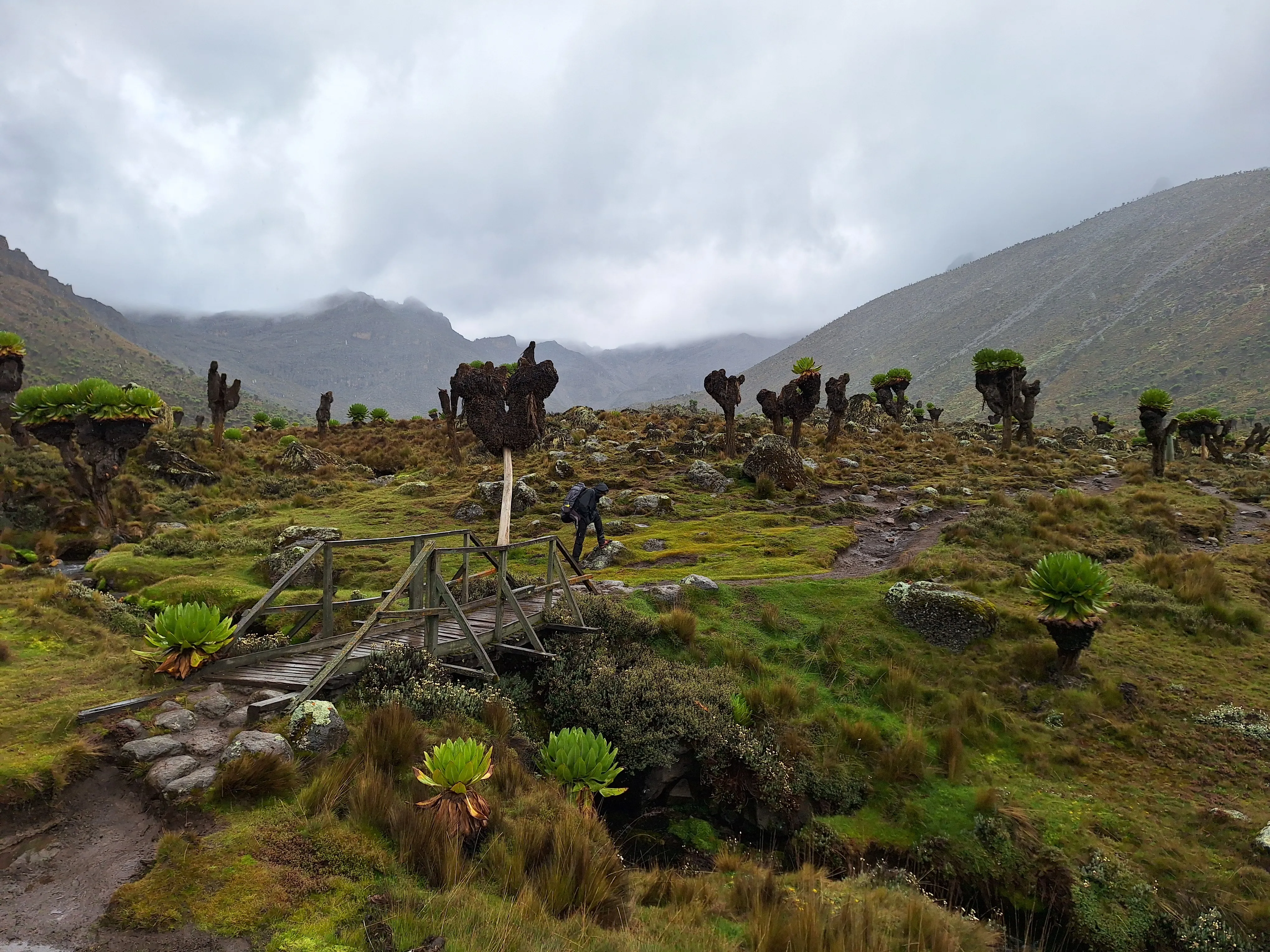 Dis 2003 en ons eerste dag se stap is so 8km teen ‘n konstante helling op ‘n grondpad wat later ‘n tweespoor word. In die bergwoud sien ons sebras maar geen buffels in die kort stukkie bamboeswoud nie. Ons kamp by Old Moses is ‘n plat stukkie gras met ‘n nuuskierige Bergwagter wat ons vermaak.
